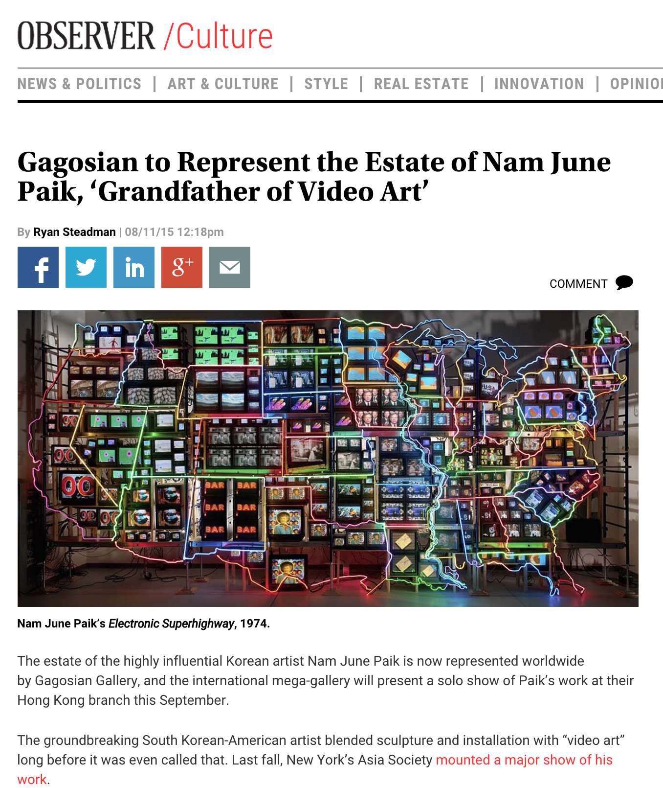 We are happy to share the news that influential South Korean artist Nam June Paik is now represented by Gagosian Gallery worldwide.